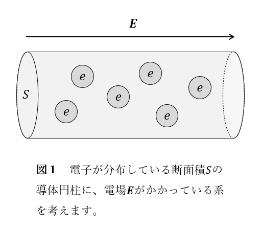別の証明 導体中を流れる電流を定量化して考える単純なモデルとして、図1のように断面積\(S\)の導体円柱内部に、数密度\(n\)で電子が分布している系を考える。導体内部を電子が運動すると、導体中の分子に衝突するなどして抵抗を受けるが、これを速度に比例する比例係数\(\alpha\)の抵抗力で近似することにする。