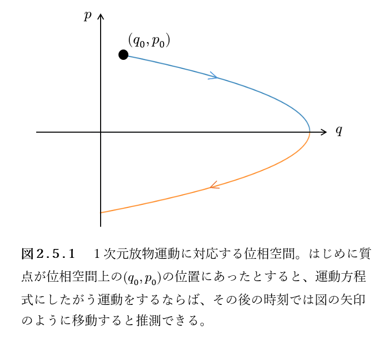 図2.5.1のように、たとえばはじめに質点が位相空間上の\(q_0,p_0\)の位置にあったとしましょう。これは\(p_0 >0\)ですから、\(z\)座標が\(q_0\)であるような、\(z\)軸方向に正の速度をもつ質点に対応します。この質点は運動方程式にしたがう運動をするならば、やがて最高点に達してから落下するので、とりあえず\(z >0\)の範囲では図の矢印のように配位空間上を移動すると推測できますよね。
