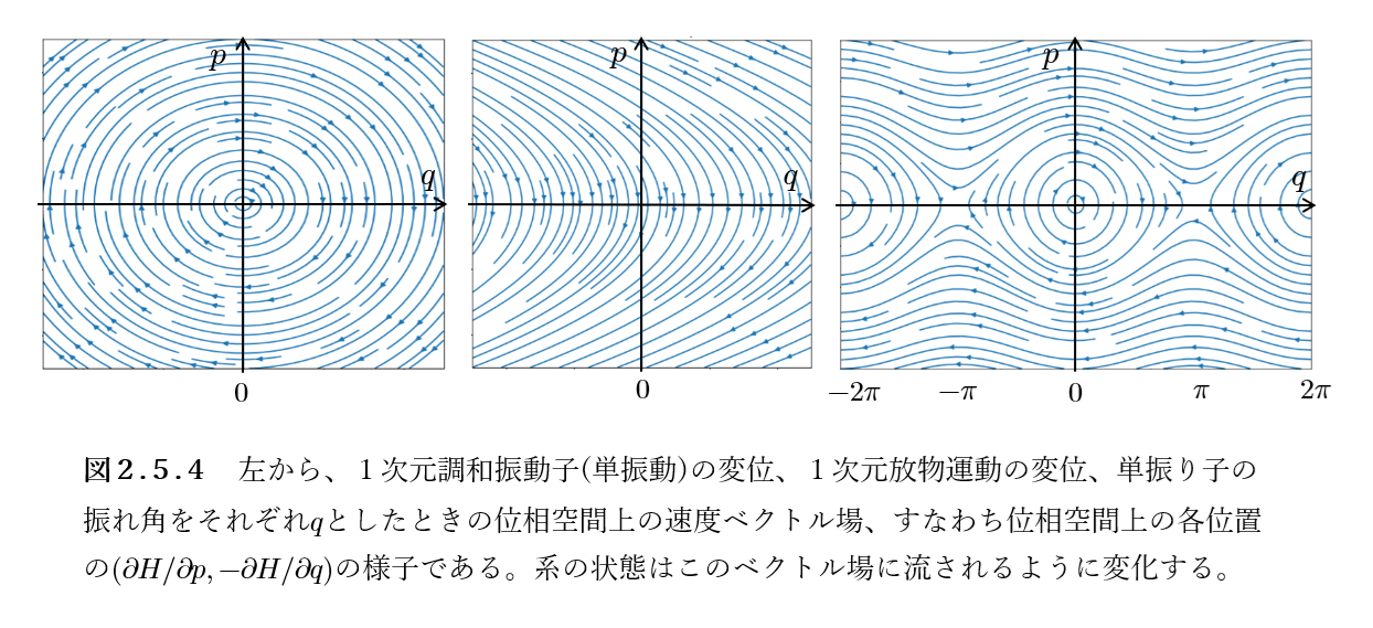 $$となります。これより、位相空間上の位置\((q, p)\)における速度ベクトルは、