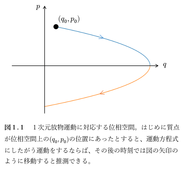 図1.1のように、たとえばはじめに質点が位相空間上の\(q_0,p_0\)の位置にあったとしましょう。これは\(p_0 >0\)ですから、\(z\)座標が\(q_0\)であるような、\(z\)軸方向に正の速度をもつ質点に対応します。この質点はニュートンの運動方程式にしたがう運動をするならば、やがて最高点に達してから落下するので、とりあえず\(z >0\)の範囲では図の矢印のように配位空間上を移動すると推測できますよね。