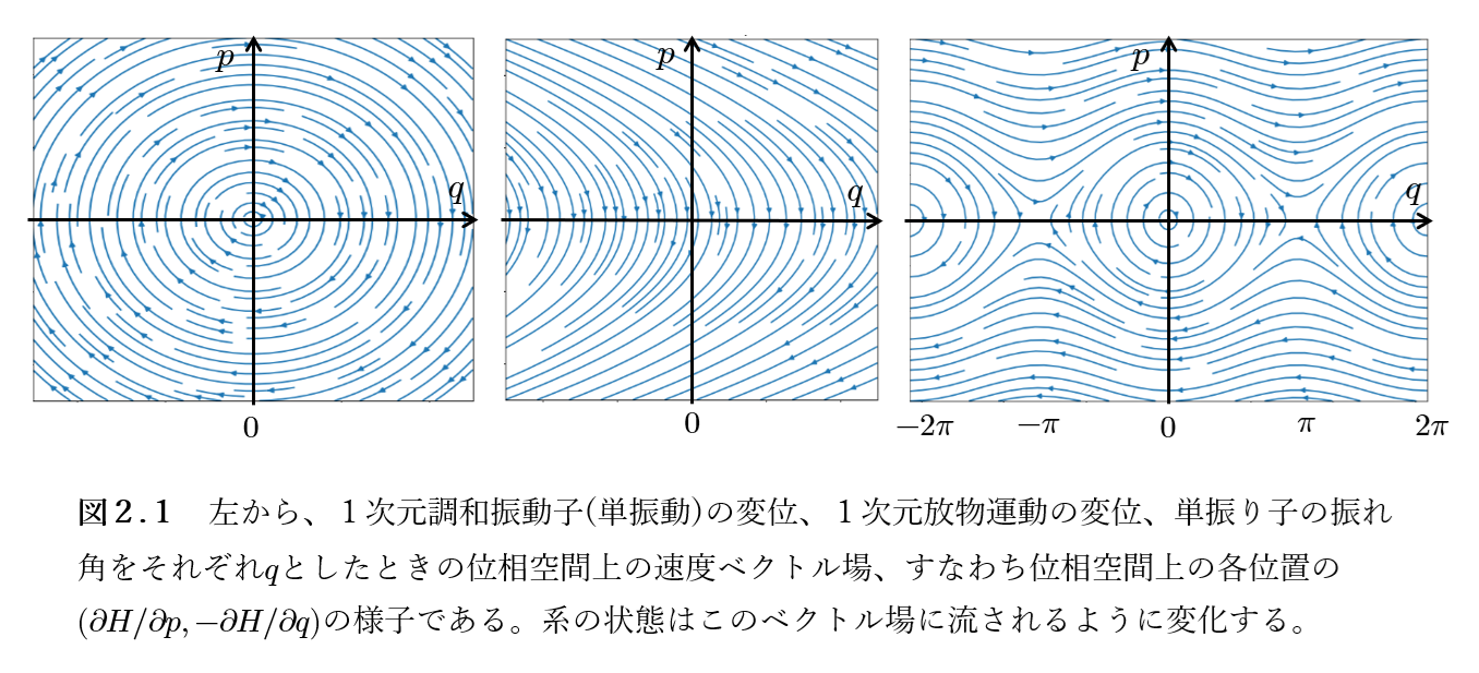 $$とかけるので、その速度ベクトル場は図2.1の一番左の図のようになります。この図からどんな運動かを読み取りましょう。矢印を繋ぐと、原点を中心とした時計回りの渦になっていて、行ったり来たりを繰り返す振動をするとわかります。また、図の真ん中の原点\((q, p) = (0, 0)\)は、バネが自然長でかつ静止している状態ですが、この点では速度ベクトルも\((\dot{q}, \dot{p})\)も\((0, 0)\)になるため、ここが安定な平衡点であることもわかりますね。