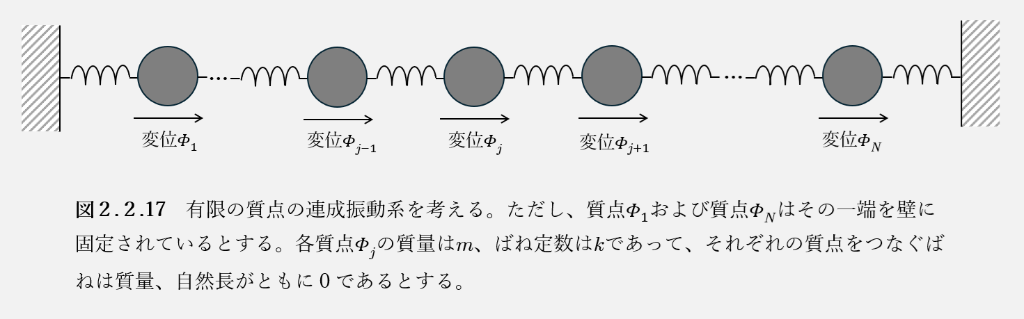 $$とかくことができる。続いて、両端が壁に固定されているため、壁の変位を\(\Phi_0 = 0\)、\(\Phi_{N+1} = 0\)と書くことにすると、ばねの自然長は0であるため、質点\(\Phi_{j-1}\)と\(\Phi_j\)の間のばねの伸びは\(\Phi_j – \Phi_{j-1}\)となるから、系全体の弾性エネルギーは