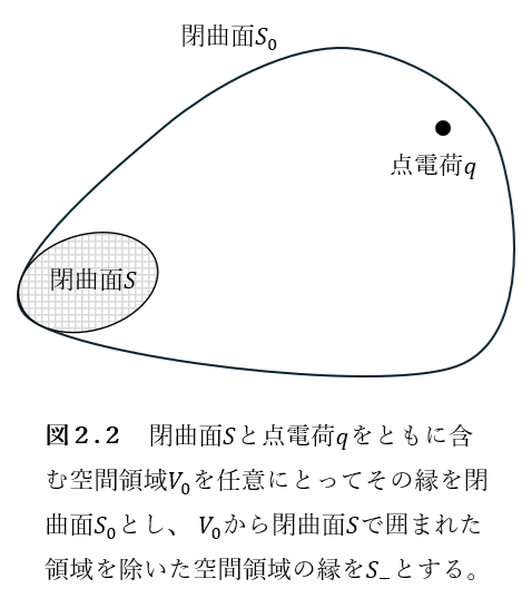 証明 任意の閉曲面\(S\)について、その閉曲面上での電場の面積分を計算する。図2.2のように閉曲面\(S_0\),\(S_{-}\)をとると、面積分の性質から、