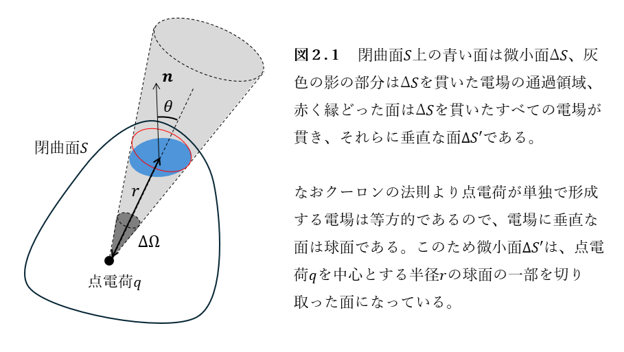 証明 任意の閉曲面\(S\)について、その閉曲面上での電場の面積分を計算する。図2より、\(\Delta S’=\Delta S \cos \theta\)であり、また立体角の定義から、半径\(r\)の球において立体角\(\Delta \Omega\)に対する曲面\(\Delta S’\)は、\(\Delta S’=r^2 \Delta \Omega\)と表せることをふまえると、