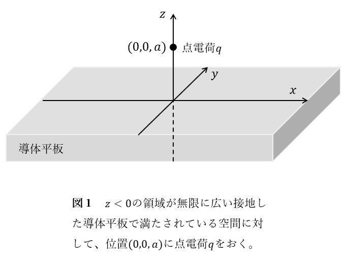 証明 \(z<0\)の領域が導体で満たされている空間に対して、位置\((0,0,a)\)に点電荷\(q\)をおいたときの、\(z \ge 0\)の領域につくられる静電場を\(\boldsymbol{E}_1(\boldsymbol{r})\)とする。また、分極の生じない自由空間中で、位置\((0,0,a)\)に点電荷\(q\)を、位置\((0,0,-a)\)に点電荷\(-q\)をおいたときの、\(z \ge 0\)の領域につくられる静電場を\(\boldsymbol{E}_2(\boldsymbol{r})\)とする。